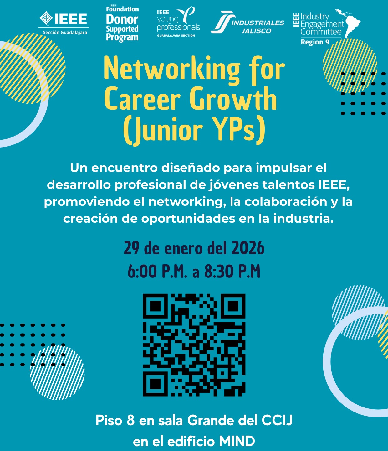 Invitación al evento Networking for Career Growth (Junior YPs), dirigido a profesionales en la industria y personas con estudios de posgrado interesados en fortalecer su red profesional y generar oportunidades de colaboración.📅 29 de enero de 2026⏰ 6:00 p.m. –